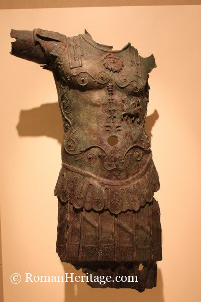 Torso de bronce del museo de Cádiz. Escultura que representa a un emperador divinizado. Se conserva la casi totalidad del torso, la pierna derecha y el hombro izquierdo y hay otros elementos sueltos que podrían pertenecer a la misma pieza. La figura masculina aparece de pie, descalzo y con armadura militar. En la coraza se aprecian dos grifos afrontados y un candelabro central; una máscara de océano la decora debajo del cuello y unos roleos rematados en rosetas rodean el frente, la zona ventral y los costados. Esta escultura sigue el modelo del Augusto de Prima Porta. El lugar donde apareció se identifica con el Templo de Hércules Gaditano, en Sancti Petri, por lo que se supone que estaría ubicada en él.